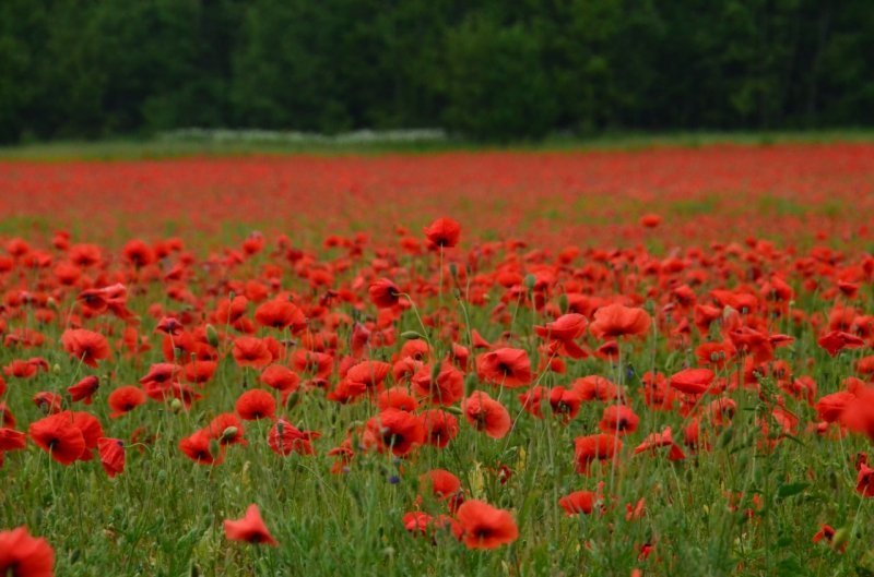 Цветущее маковое поле выглядит невероятно живописно: тысячи алых цветов устилают землю, создавая впечатление красного ковра. Это зрелище особенно впечатляет на фоне зелёных лугов и голубого неба.